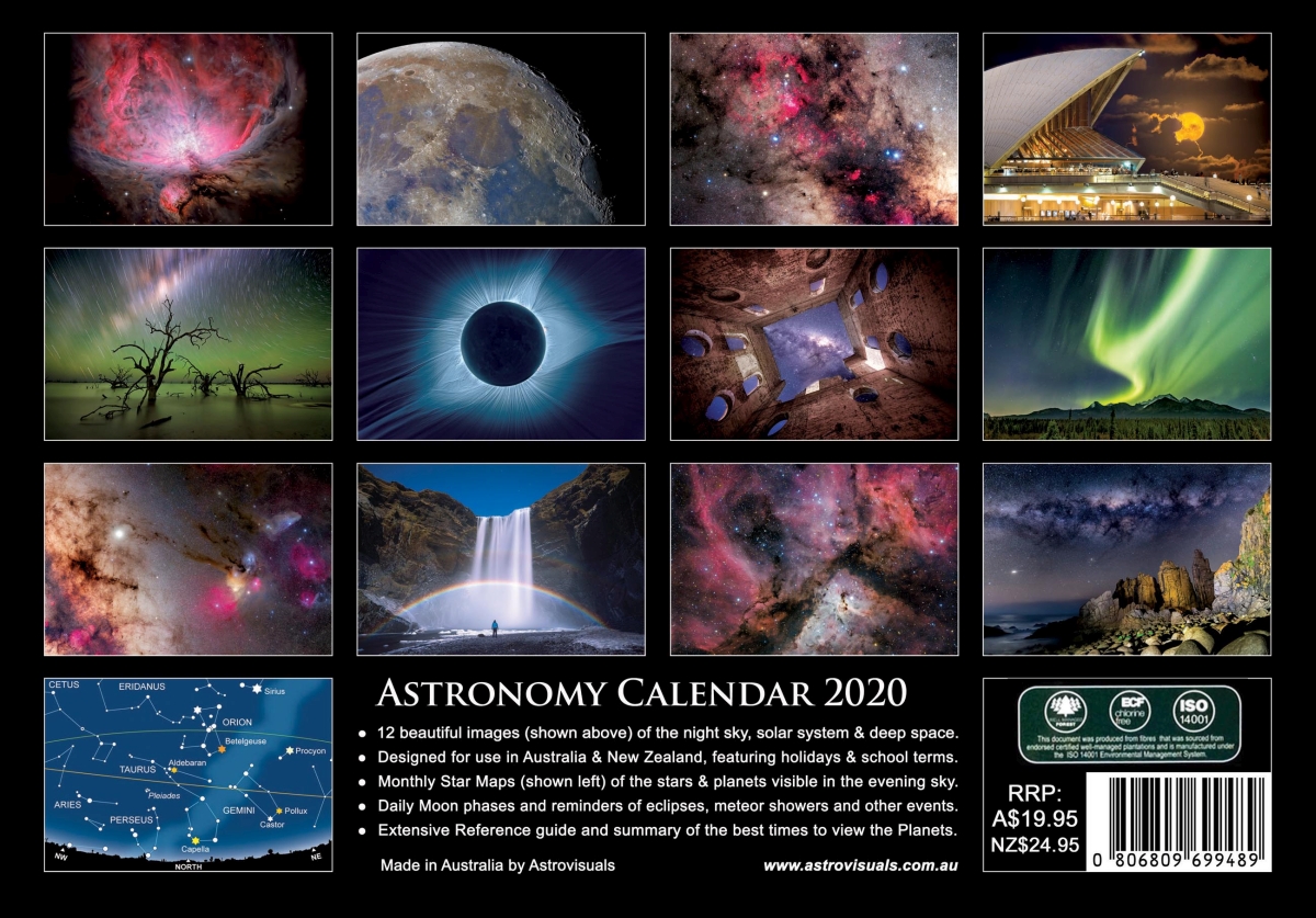 The Astronomy Calendar this year features the winning images from the “David Malin Awards 2019”, Australia’s premier photographic competition for amateur astronomers. The 12 images featured were the winners of the major categories, plus others that received honourable mentions.